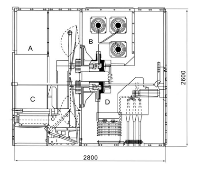 | Dimensions (WxDxH): 1400x2800x2600 | Schematic diagram of the structure of the Switchgear A relay instrument room B bus room C circuit breaker room D cable |