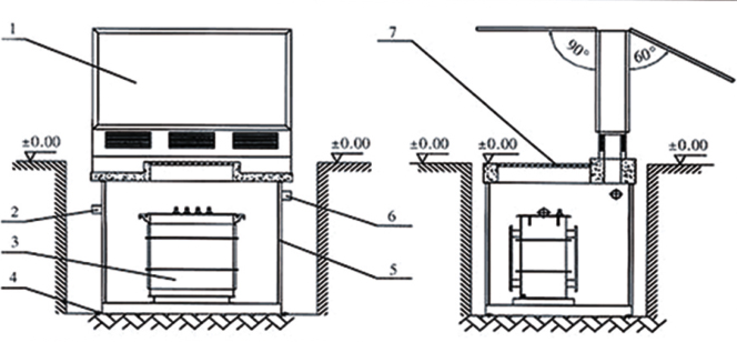 | Fig. 1 Schematic diagram of semi-buried box transformer structure 1-Light box-type power distribution equipment: 2-High-voltage cable inlet hole; 3-Underground combined transformer: 4-Pitpit foundation installation hole 5-Prefabricated ground play foundation; 6-Low-voltage cable outlet hole; 7-Pit operation port cover |